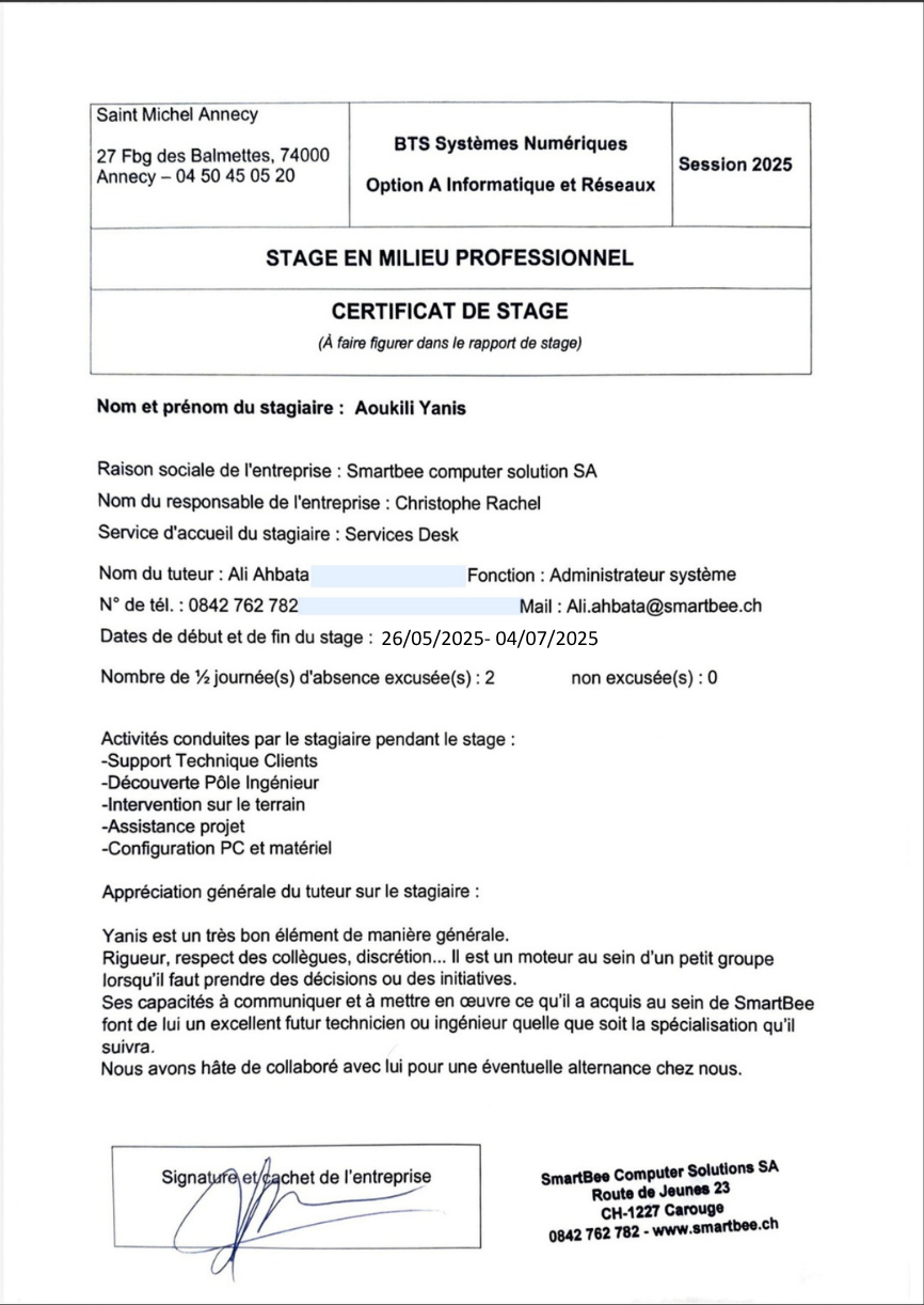 Stage chez SmartBee, une entreprise spécialisée en solutions informatiques et de sécurité basée à Genève. Intégré dans l'équipe infrastructure et support, j'ai contribué à la sécurisation des accès distants, la gestion de l'infrastructure client et l'initiation aux outils de supervision.
